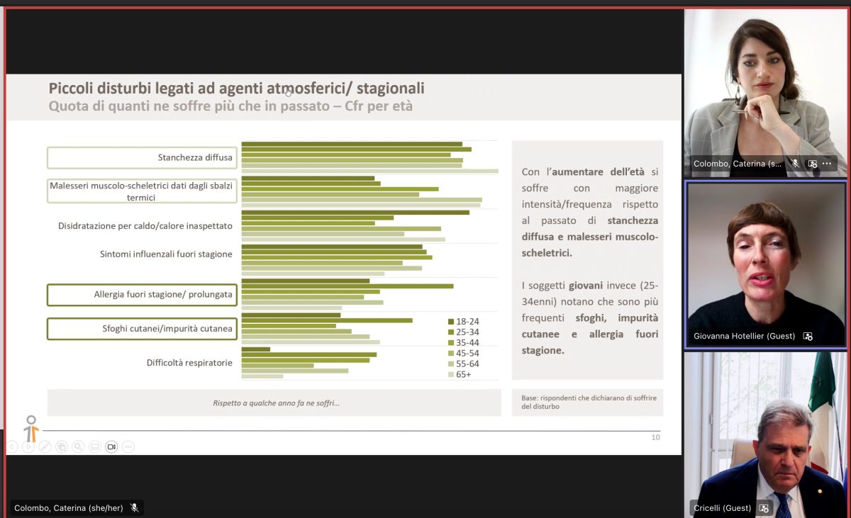 “All’aumentare dell’età – spiega Giovanna Hotellier, Data Analyst e Market Research di Human Highway – aumenta anche la consapevolezza delle persone, i giovani ne hanno sentito parlare ma meno degli over64. Allo stesso modo, tra le donne (84,2%, rispetto al 64,4% degli uomini) e le persone più istruite l’argomento è più sentito. Tra i principali disturbi segnalati ci sono stanchezza, malesseri muscolo scheletrici, influenze e allergie fuori stagione”. Il problema è sentito tra gli over 65 (53,5%) e i giovanissimi (50,7%), meno sentito dai 45-54enni (39,6%). “E’ un tema di grande rilievo – conferma Claudio Cricelli, presidente Emerito della Società Italiana di Medicina Generale e delle Cure Primarie – ormai la percezione sta aumentando ovunque. Non tutto quello che percepiamo deve essere correlato ai cambiamenti climatici, tuttavia è importante che le persone ragionino su quanto questi cambiamenti possono influire sulla loro salute”. Le persone tra i 45 e i 65 anni vengono definite da Cricelli “confuse”: “rappresentano”, afferma, “i responsabili e le vittime delle conseguenze future delle loro decisioni e scelte attuali. Secondo l’esperto, i giovani ne sono colpiti “per ragioni culturali, c’è una crescente preoccupazione perchè reagiscono come i titolari del futuro”, mentre i più anziani ne sono coinvolti “perchè con gli anni si diventa più vulnerabili”. C’è quindi “un’eccellente correlazione tra cosa le persone percepiscono e cosa dicono”. Cricelli cita la grande ondata di caldo del 2003, con una stima di circa 35mila decessi in eccesso: “Noi osserviamo il fenomeno da scienziati, le persone lo subiscono sulla loro pelle”. In aumento le segnalazioni di stress ambientale che minano il sonno, disturbandolo. “E’ quello che vediamo nelle grandi città – ribadisce Cricelli – le persone percepiscono il rumore e questo influisce sul riposo”.